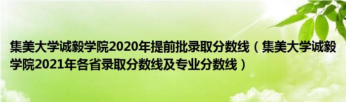 大家好,小高來(lái)為大家解答以上問(wèn)題。集美大學(xué)誠(chéng)毅學(xué)院2020年提前批錄取分?jǐn)?shù)線(xiàn),集美大學(xué)誠(chéng)毅學(xué)院2021年各省錄取分?jǐn)?shù)線(xiàn)及專(zhuān)業(yè)分?jǐn)?shù)線(xiàn)很多人還不知道,現(xiàn)在讓我們一起來(lái)看看吧!