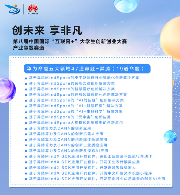 作為產(chǎn)業(yè)命題賽道的第二年,今年華為命題涉及領(lǐng)域更廣,培訓(xùn)支持力度更大。命題方面,華為總體命題數(shù)量達(dá)到47道。其中,鯤鵬命題細(xì)分領(lǐng)域中,鯤鵬應(yīng)用使能套件BoostKit新增3個(gè)命題,昇騰AI命題中,AI框架昇思MindSpore、異構(gòu)計(jì)算架構(gòu)CANN、行業(yè)應(yīng)用開(kāi)發(fā)套件MindX SDK共增加14道命題;培訓(xùn)支持方面,在大賽期間,華為將通過(guò)線(xiàn)上+線(xiàn)下的形式,為參賽隊(duì)伍賦能,各領(lǐng)域?qū)<也粌H會(huì)針對(duì)命題進(jìn)行線(xiàn)上直播培訓(xùn),還將走進(jìn)校園,與參賽隊(duì)伍面對(duì)面交流。同時(shí),報(bào)名后,參賽隊(duì)伍所需的算力、處理器等資源將由華為提供。